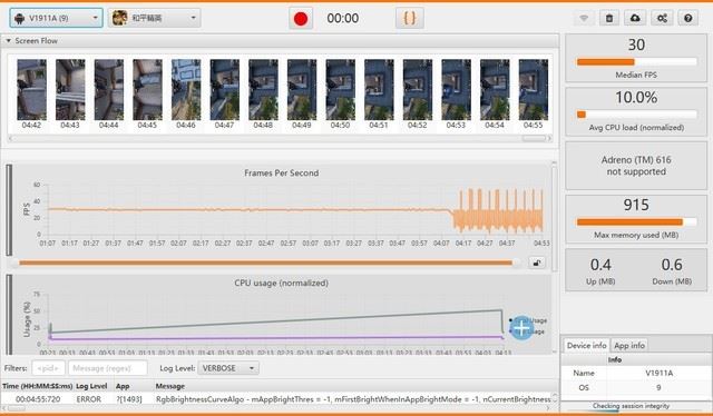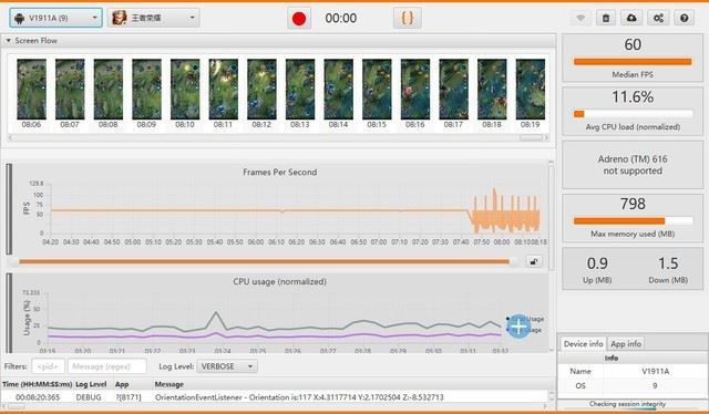 接下来我们使用了《王者荣耀》、《和平精英》两款游戏来进行实际测试,Gamebench作为监测软件。其中由于软件目前存在兼容性问题,因此部分帧率会存在异常波动。
