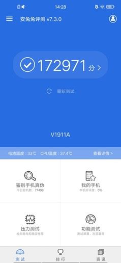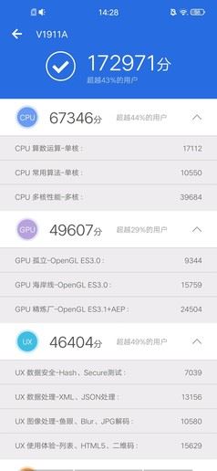 经过安兔兔的跑分,vivo Z5x综合成绩为172971,其中CPU成绩为67346、GPU成绩为49607、UX成绩为46404。这样的成绩的确配得上中高端的配置,在一众千元机型中更是十分亮眼。这款骁龙710芯片CPU最高主频高达2.2GHz,更有Adreno 616 PC级图形处理GPU,整体性能较前代提升20%,GPU性能提升高达35%,可以说面对各种大型游戏都不在话下了。