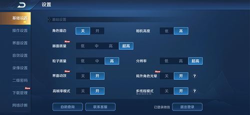 王者荣耀将画面质量和分辨率开至超高,粒子质量开高,界面动效、光晕、高帧率、多线程等选项选择开启,简单来说就是能开的全开,能调高的全调高。