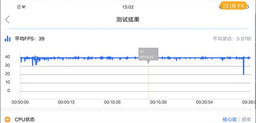 剔除2分钟之前的载入阶段和最后死亡的异常波动,游戏过程中帧率曲线虽然有锯齿状波动,但帧率其实维持在一个较高水准,平均帧率达到了39fps,平均波动0.97帧,游戏中最低帧率也达到了37fps,同样保证了游戏时不会有明显的掉帧或卡顿。