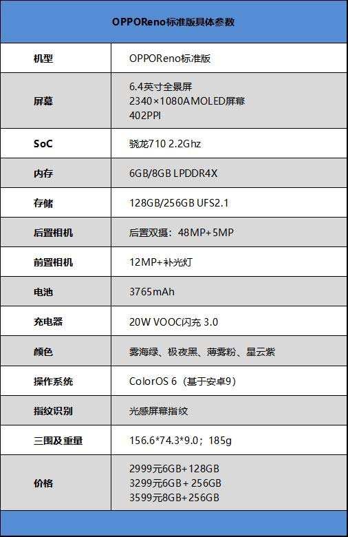 下面是OPPO Reno标准版的具体参数: