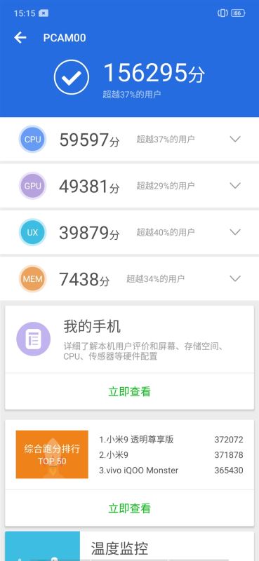 OPPO Reno标准版安兔兔的跑分成绩是156295。CPU分数是59597,GPU分数是49381。