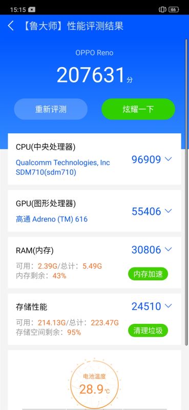 OPPO Reno标准版最后的分数是6466分,成绩与之前的骁龙835设备相当。
