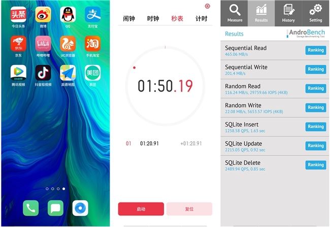 内部存储采用UFS2.1,相较于以往的UFS2.0在读写速度上有了一定的提升。直观上给人的感觉就是手机应用安装和打开速度变快了。读写速度分别是465.06MB/s、201.4MB/s。