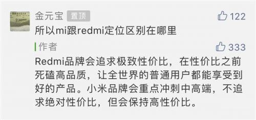 在今天雷军微信号的推送中,有读者问mi跟redmi的定位区别,官方进行了回复:小米品牌会重点冲刺中高端,不追求绝对性价比,但会保持高性价比。