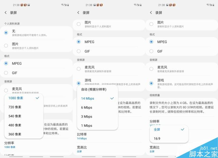 虽然高通骁龙675的游戏性能较为一般,但是A60元气版还是给了酷爱展示自己游戏操作的使用者以机会——最高可达1080P分辨率以及14Mbps的高比特率录制方式,不仅超过了国内二压门槛T1的bilibili的6Mbps,也超过了油管1080P@60P的码流限值(当然三星并没有提供帧率选项,是个小遗憾)。
