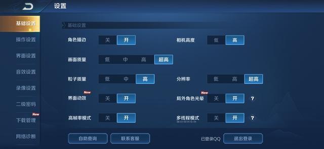 王者荣耀游戏画面设置为:开启角色描边、画面质量超高、粒子质量高、分辨率超高、界面动效开、局外角色光晕开、高帧率模式、多线程模式,特效全开。游戏过程绝大部分时间都比较流畅,少部分复杂团战场景帧数会有略大的波动,但也能保持较好的流畅度。