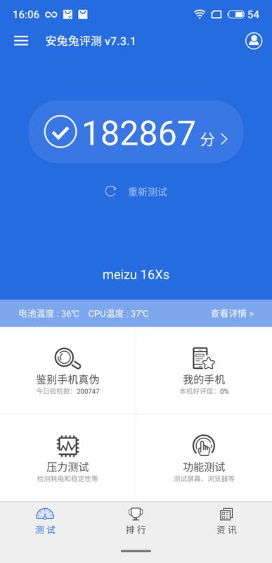 从安兔兔跑分来看,魅族16Xs跑分为182876分,超越47%的用户,将这个性能放在千元机阵列里,已经是出类拔萃。具体各个方面来看,CPU跑分82192分,GPU跑分36491分,UX跑分49955分,MEM跑分14229分,表现出色。