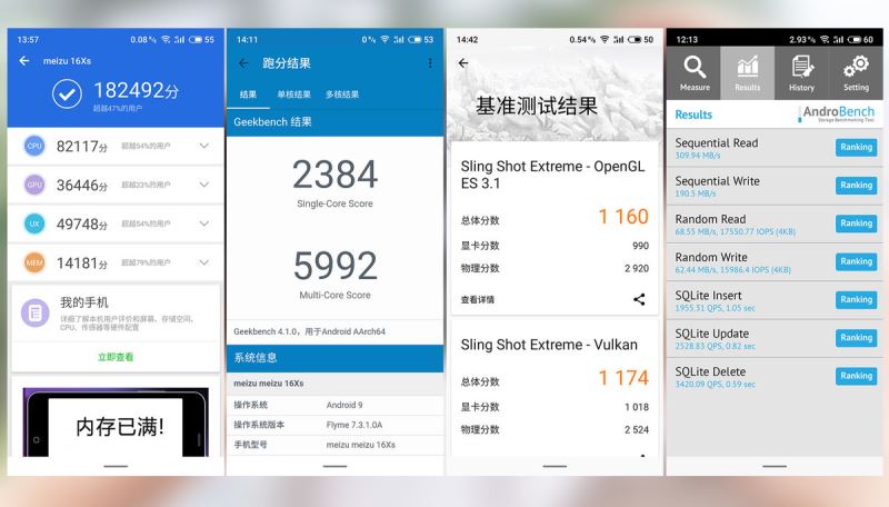 从三大跑分平台的成绩来看,魅族 16Xs 和同平台机型的成绩相差不远,在当下安卓阵营中属于中等偏上的水平。但需要注意的是,根据 Androbench 给出的成绩来看,魅族 16Xs 配备的还是 EMMC 闪存芯片。