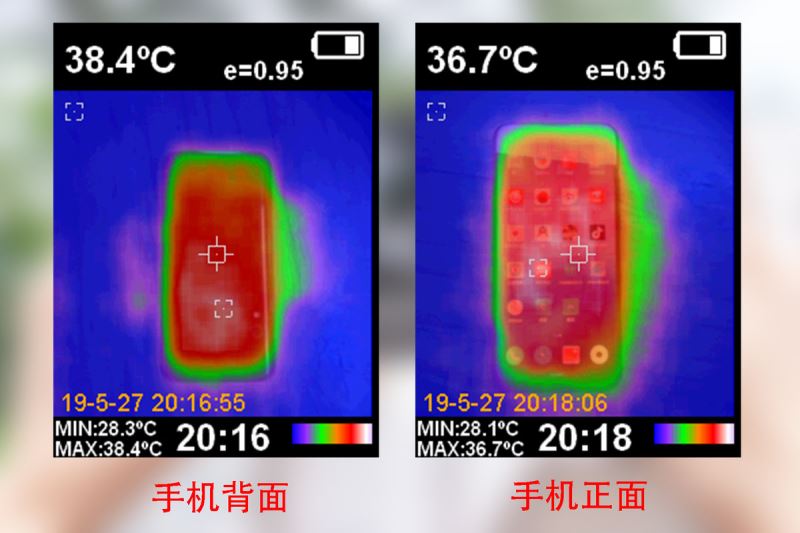 尽管 CPU 的核心调度情况较为积极,但在游戏过后的机身温度却相当可观,从红外热成像图可见,机身背部与机身正面温度都处于正常范围,同时背部温度分散较为均匀。当然了,性能需求更苛刻的游戏,机身温度的变化就更为明显。