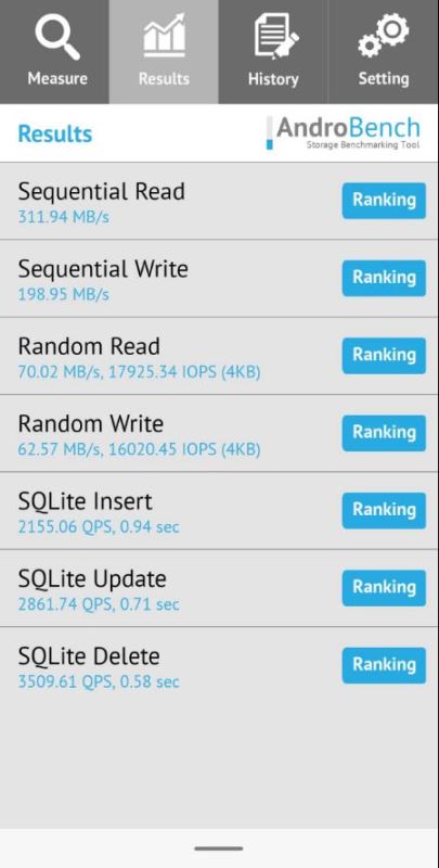 Androbench简介:AndroBench是一个基准测试应用,可以测量Android设备的4K随即存储·存储性能,包括内部或外部存储。