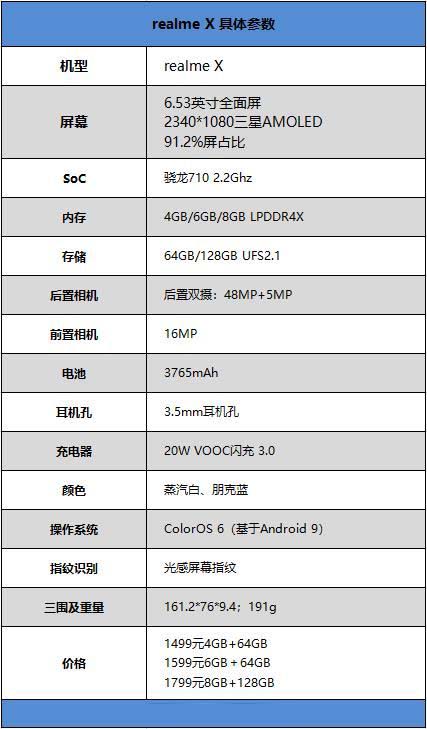 除了朋克蓝外realme X还有一款白色机型,官方称作蒸汽白。因为工艺成本等原因,白色机型的成本一般都会高于其他配色,这也是现在很多新手机都不再推出白色版的原因。如果你在颜色有所纠结,可以优先考虑白色