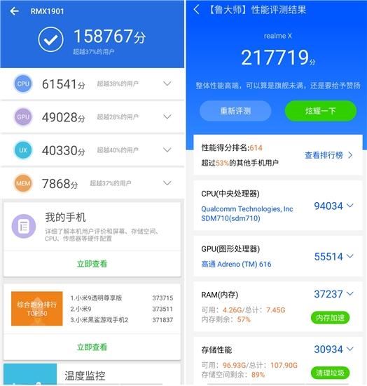 对我们来说,手机性能就像手机电量,剩余99%,即使用不完,放在那儿看着就很安心。对于realme X,骁龙710加上UFS2.1这样的配置足够大多数用户碗儿里吃着锅里看着了。