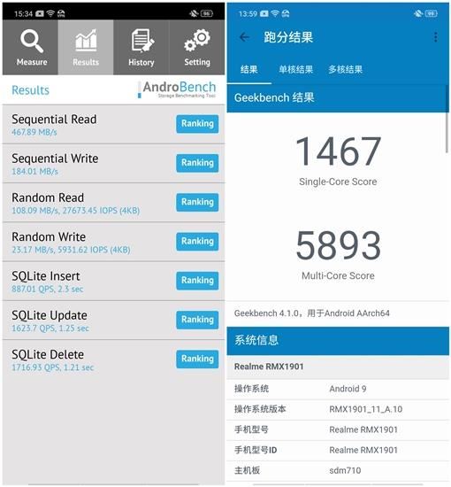 Realme X的芯片采用的是大家非常熟悉的高通骁龙710,10nm制程,出色的功耗表现,使它成为近期许多热门手机的标配。我们手中拿到的realme X是售价1799元8GB+128GB的顶配版,接下来开始进行各项性能测试: