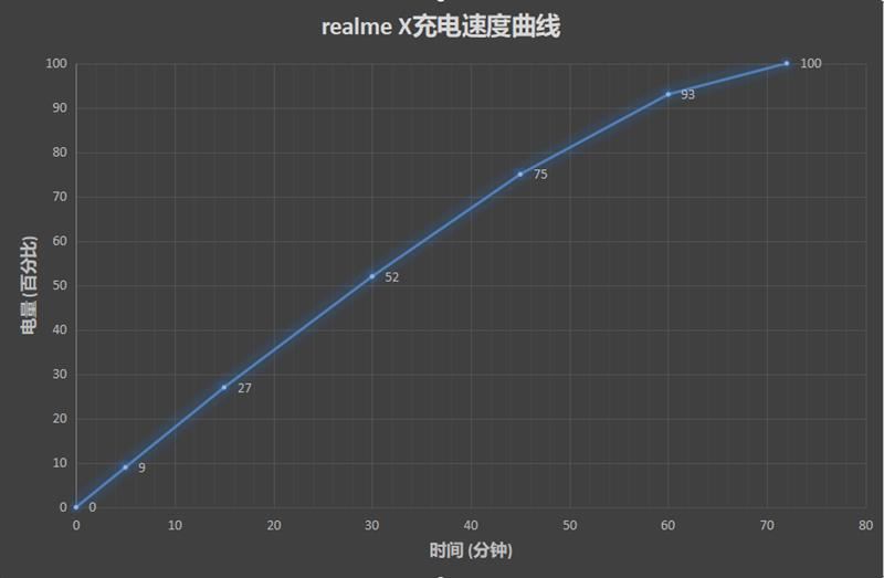 在关机状态下,30分钟电量从0%冲至52%,60分钟冲至93%,充满总共用了72分钟。传统的充电机制是低电量状态快速冲电,接近充满时开始”涓涓细流“。VOOC闪充技术的意义就在于,手机即使在将要充满的时候也能保持高速充电状态。