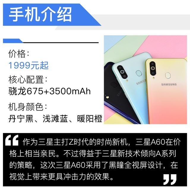 PS:此次三星Galaxy A60(以下简称三星A60)还推出元气版,提供了6+64GB版本,售价为1499元。