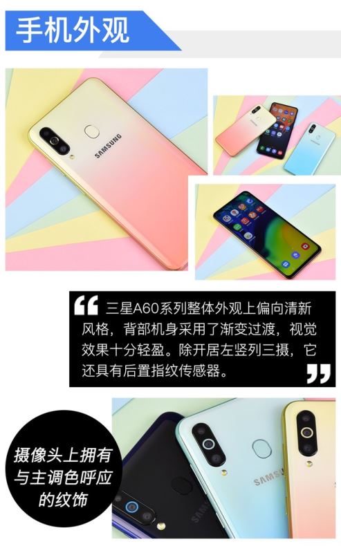 这一次三星A60外观细节亮点十足,三星通过对黑瞳全视屏的进一步下放,为旗下中端机型带来了更强的竞争力表现。在目前同价位段产品中,屏下开孔技术的产品还是比较少,如果你想要体验的话,三星A60会是一个不错的开始。