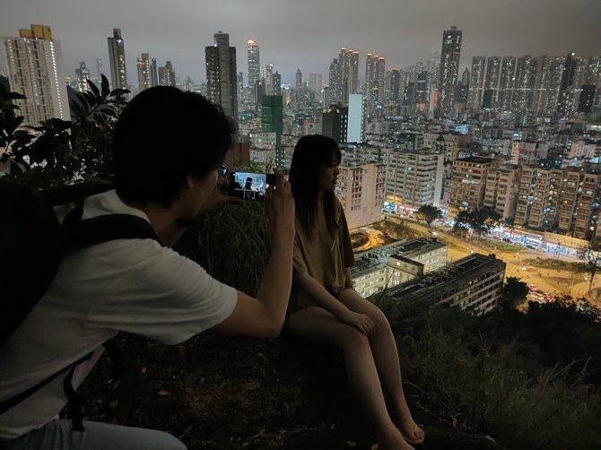 超清夜景2.0即复合多帧降噪和多帧HDR技术,这是当下很流行的一种夜拍技术。而Reno Z的优势在于,不仅能让场景拍亮,而且对人像也进行了相对的优化。为了体验这个功能,我们在近乎摸黑的状态下,爬到了网红拍照圣地嘉顿山上。