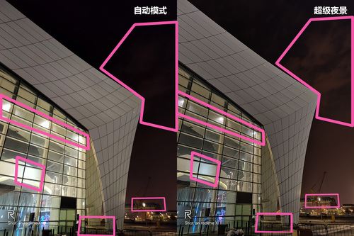 这也就是说明凭借着多帧合成的优势,超级夜景模式样张能在主体曝光适当的情况下展现出更大的动态范围,多帧曝光中的长曝光素材贡献出了更丰富的暗部细节,这一点在画面底部的栏杆及建筑纹路部分同样有所体现。