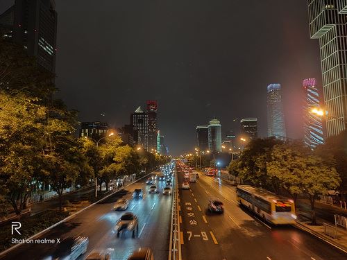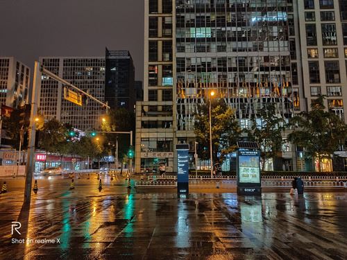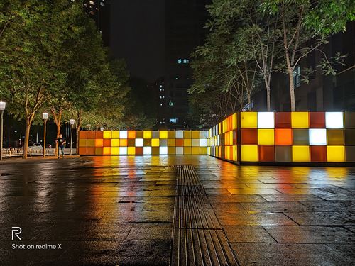 而且realme X的超级夜景样张也表现出了优秀的色彩还原能力,在控制高光范围,清晰还原出亮起和熄灭色块区别的同时,灯箱本身到的色彩饱和度也没有出现缺失,合成之后的黄色、橙色以及树叶的绿色都依然保持鲜明,地面雨水所反射的色彩之间过渡也清晰自然。