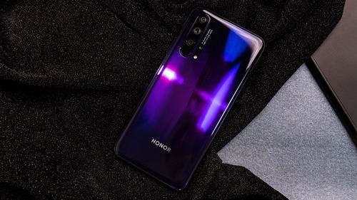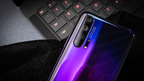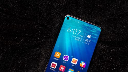 荣耀产品一直主打潮美外观,所以在设计方面一直颇有想法。荣耀20 PRO正面是一块6.26英寸的魅眼全视屏,屏幕分辨率2340*1080,顶部挖孔孔径和下巴的宽度控制都很不错,顶部仅保留了紧凑的听筒,91.7%的高屏占比带来了更具沉浸式体验的全面屏观感。