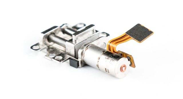 OPPO Find X的双轨潜望结构的推进马达为螺旋步进电机,由Nidec (日本电产株式会社)生产,通过旋转螺旋杆实现滑块的位移。由于双轨潜望结构有阻滞结构和内部轨道以及缓冲片的缓冲,因此并没有将缓冲弹簧与之搭配。