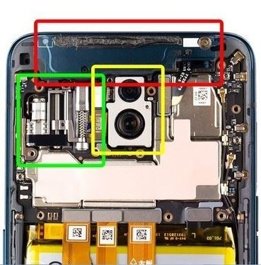 主板区域由于遭到了侧旋升降结构(红框)、步进马达(绿框)以及后置双摄(黄框)的挤压,显得非常紧凑,然鹅,依旧没有采用层叠主板。侧旋升降结构.上的部件通过排线与主板相连。由于主板区域的空间得到了有效控制,因此电池的空间并未缩减。