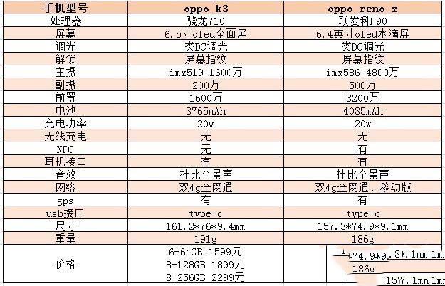 我们先来看看,oppo k3和oppo reno z的参数配置情况
