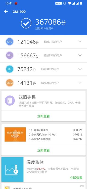 运行内存8GB起步,顶配12GB,在硬件用料上一加从来都是走在国际前列的。我们手上这台一加7是8GB+256GB的版本,接下来是一系列跑分测试。