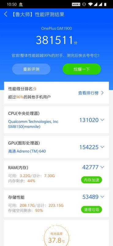 鲁大师跑分38万+,整体性能超过99%的对手。