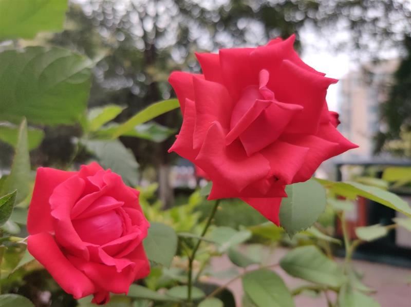 在微距样张中,背景虚化能力得到了有力的证明,花朵,绿叶和远处的树木,层次分明。