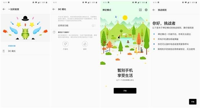 禅定模式是一个控制手机使用时间的功能,开启后20分钟内无法退出,所有手机通知都会被屏蔽(可以接听电话和进行紧急呼叫)。习惯使用之后,当你丢下手机不会再有与世界断联的恐慌,就如同一加所说的:暂别手机,享受生活。