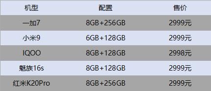 由于各家内存配置大小不一,为了方便对比,这里选取了在2999(8)元这个价位。除了刚发售的红米K20Pro与一加7一样是8GB+256GB,其它均为128GB内存,发售较早的小米9运行内存只有6GB。其中魅族16s为618期间优惠500元后的价格。