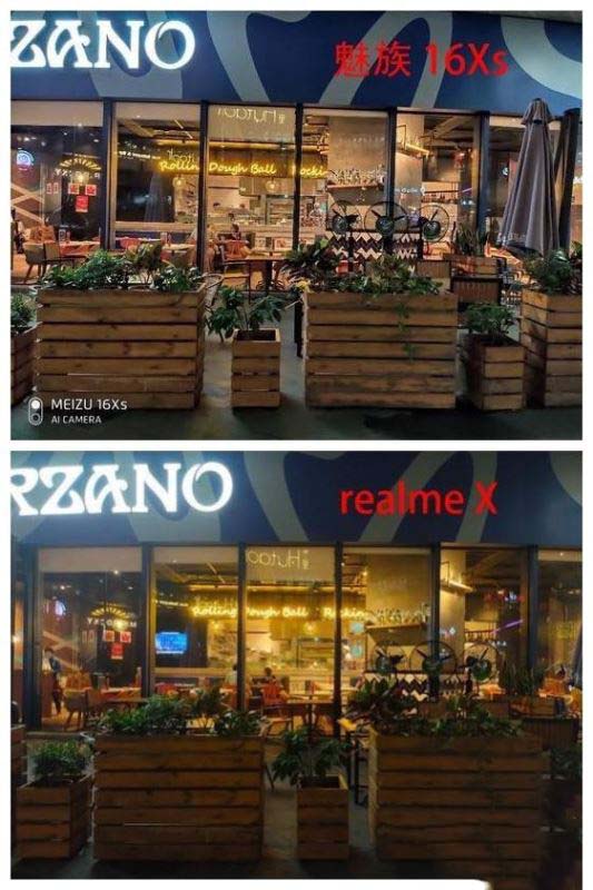 白天光线充足,从上面两张照片可以看出,魅族 16xs 和 realme x 的表现在同一等级,不过在画面亮度和细节上,魅族 16xs 还是稍微胜出。从这组户外花草的样张中,也可以明显的看到,realme x 颜色偏暖,甚至有点泛黄。而魅族16xs 色彩更接近花草的原貌。而且,魅族16xs还有广角镜头,这是realme x所不具备的。据官方宣称,魅族16xs拥有118.8度超广角,等效焦距13mm,视野更开阔。