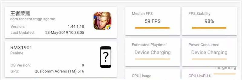 realme x加入了oppo自主研发的Hyperboost 2.0超速引擎,配备上高性能游戏模式,在《王者荣耀》游戏中,打开超高画质和超高分辨率后,realme x帧数全程稳定在59FPS,帧数稳定率98%,非常稳定,没有掉帧的现象。