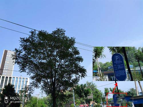 两者由于像素相同,所以在画面的具体细节处理上比较接近,比如树的层次感、以及右下角的车牌,字体的清晰度基本接近,但是魅族16Xs在字牌这里颜色有点过于浓艳,范围会使得字体的细节处理不是很到位。