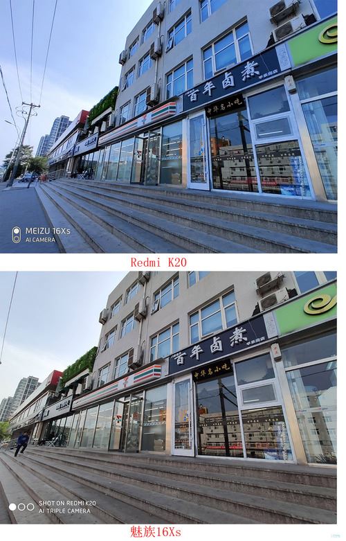 两者选择了两种不同的模式,魅族16Xs选择牺牲细节而换取画面整体的纯净度;Redmi K20则是在牺牲一定纯净度的情况下尽可能的增加画面的细节,比如顶部的牌子。