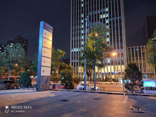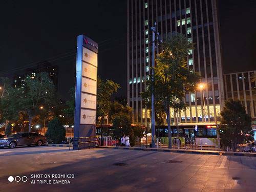 所以,当两者开启超级夜景模式后,在曝光和ISO相差无几的情况下,Redmi K20利用四合一像素合成1.6um,加上1/2.0的底,使得亮度和细节都有了有效提升;而另一边,魅族16Xs之前广告牌过曝的情况在超级夜景模式下也得到了解决。