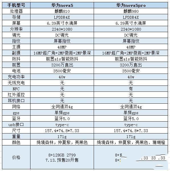 4、价格方面,华为nova5 8GB+128GB售价2799元,将于7月13日开启预售,并于7月20日正式开售。nova5 pro 8GB+128GB版售价2999元,8GB+256GB版售价3399元,现已开启预定,6月28日正式开售。