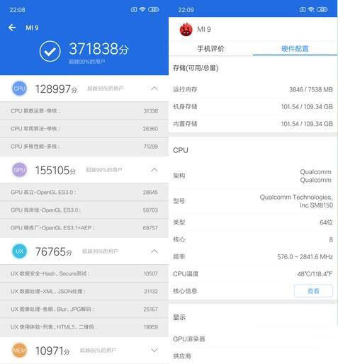 小米9搭载的是当下性能最强的骁龙855处理器,骁龙855采用了7nm工艺制程,最高主频2.84GHz,单核性能提升45%,小米9在Antutu跑分387851分。性能方面可以说己经超越现在当下所有的机型了。如下图所示: