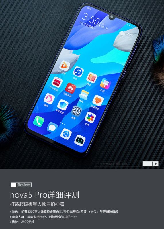 这次nova5系列带来了nove5和nove5 Pro两款产品,两款产品主要区别是采用了不同的CPU,其中nove5采用了华为最新的麒麟810芯片,而nova5 Pro使用麒麟980芯片,并且nove5 Pro拥有NFC功能,这次评测我们将以nove5 Pro进行。