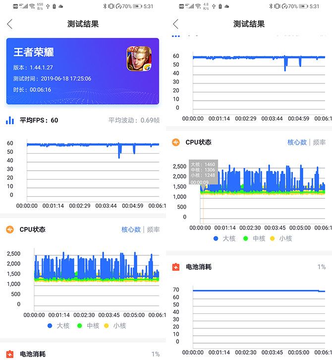 我们使用快否记录游戏的帧数,可以看到《王者荣耀》开启高帧率模式和多核心支持后,游戏长时间保持在60帧,帧数跳动只有0.69帧,nova5 Pro对于《王者荣耀》这款游戏能提供足够的性能支持,能在高帧率模式下流畅运行。