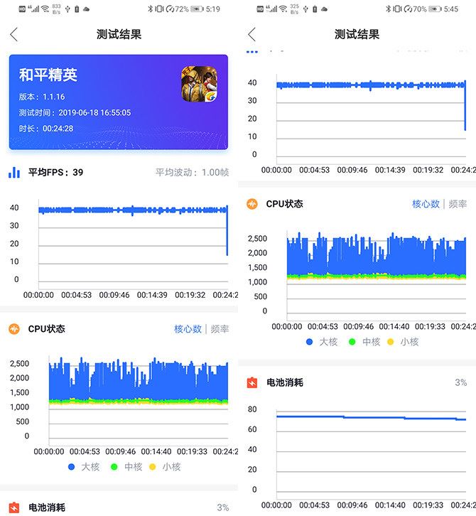另外,我们也使用《和平战场》进行测试,可以看到开启高帧率模式下《和平战场》同样长时间保持40帧,帧数跳动1帧,性能模式和GPU Tubro 下让麒麟980的性能得到完全发挥。