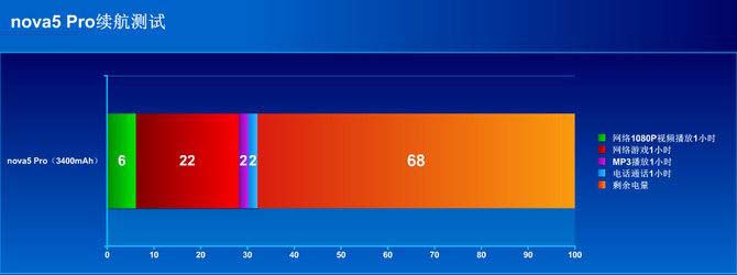 nova5 Pro配备了3400mAh电池,我们也针对华为nova5 Pro进行4小时的高强度续航测试,手机插入一张SIM卡,蓝牙、wifi、NFC打开状态,手机屏幕亮度100,每完成一项测试清理一次后台应用。首先进行1个小时网络1080P视频播放,一个小时后消耗6的电量,之后进行1个小时的游戏,消耗了22电量,在进行1小时MP3播放,消耗了2的电量,进行1小时通话测试,消耗了2的电量,4小时总共消耗了32的电量,剩余68的电量。整体来说nova5 Pro的续航表现让人满意。