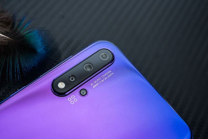 华为nova5 Pro的四个摄像头呈“L”形排布,主摄、广角和景深摄像头被放置在一直线上,这三个摄像头和LED补光灯安装在一个模块上,另外微距摄像头安装在旁边。