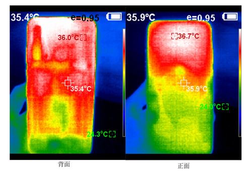 20分钟后,华为nova5i的背面最高温度为35.7℃,正面最高温度36.7℃,只是温热,整体的温控表现很不错。