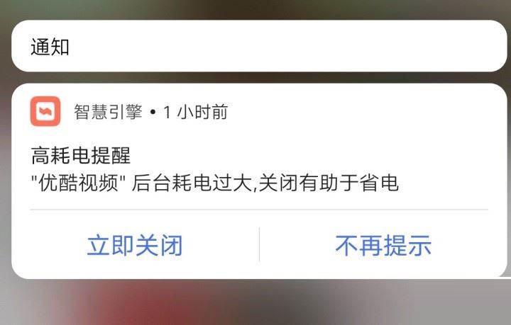 并且vivo Z5x的AI智能优化功耗功能也不错,小学弟看完电影后后台没有关闭优酷视频客户端,系统就会弹出"优酷视频"后台耗电过大的提示。
