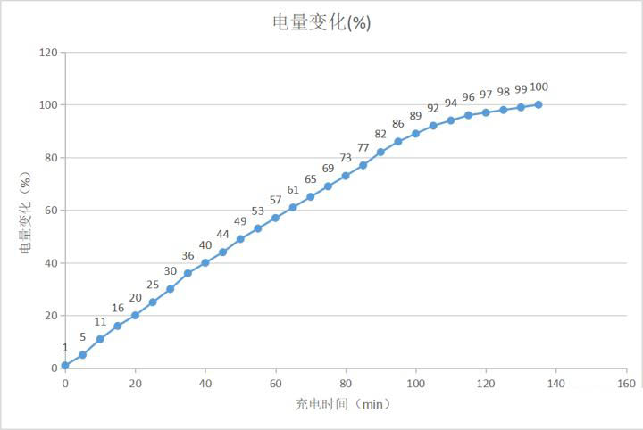 18W快充,可反向充电根据小学弟实际测试,从手机电量为1%时开始充电,每5分钟记录一次电量,作成折线图,如下图所示。