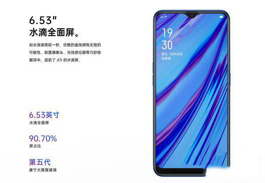 而OPPO A9采用6.53英寸水滴屏,屏占比高达90.7%,屏幕材质采用的是康宁大大猩猩玻璃,外观方面来看,继承了OPPO的优秀基因,整体观感很漂亮的说。