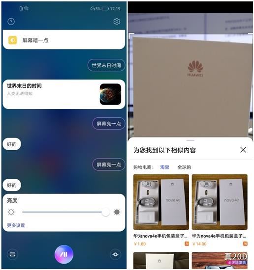 传统的语音助手这里再次升级,小艺不仅支持语音搜索、调整屏幕亮度或者发微信红包这些简单的命令,我们还可以通过它进行多项智慧视觉操作,包括识图购物,智能翻译,查看实物卡路里等。